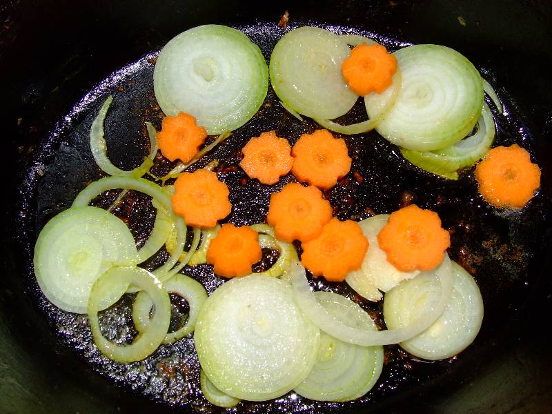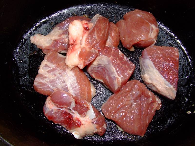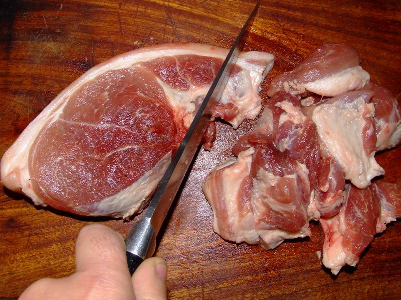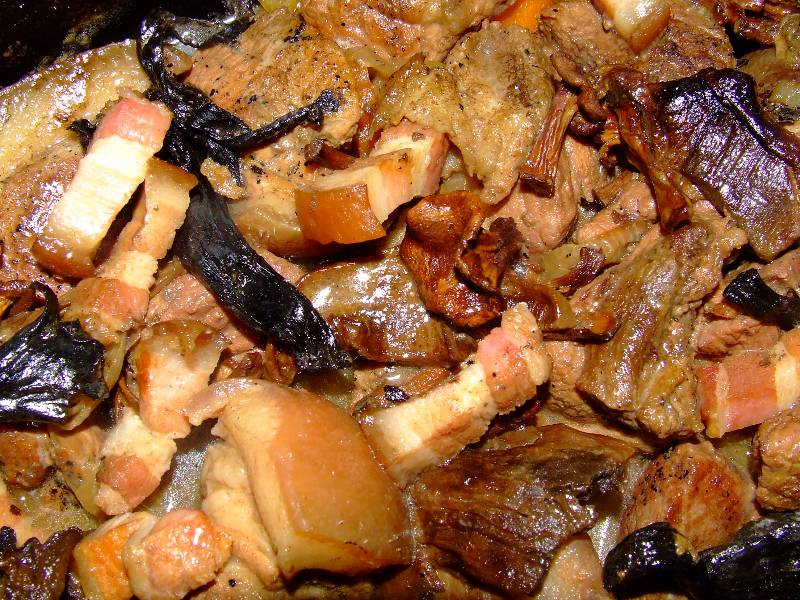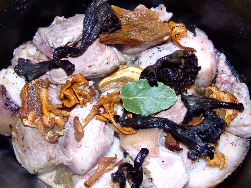 1-faire tremper les champignons dans un grand bol d'eau chaude 1 à 2 heures avant 2-désosser la rouelle en enlevant l'os central à l'aide d'un couteau pointu, découper la viande en cubes saler et mettre à dorer dans une cocotte en fonte avec l'huile 3-pendant ce temps, éplucher la carotte, tailler des encoches longitudinales à l'aide d'un canneleur, couper en rondelles, éplucher l'oignon et couper également en rondelles 4-quand ils sont bien dorés de tous les côtés, retirer les morceaux de rouelle et réserver 5-mettre la carotte et l'oignon dans la cocotte avec une noix de beurre saler et laisser dorer à petit feu 6-déglacer le fond de la cocotte avec un bol d'eau chaude, bien décoller les sucs de cuisson avec une spatule en bois, remettre les morceaux de rouelle, ajouter les champignons avec l'eau de trempage filtrée, 1 feuille de laurier, faire cuire sur feu doux à couvert pendant 45 minutes 7-ajouter la poitrine de porc fumée coupée en lardons et prolonger la cuisson encore 45 minutes sur feu moyen à découvert |