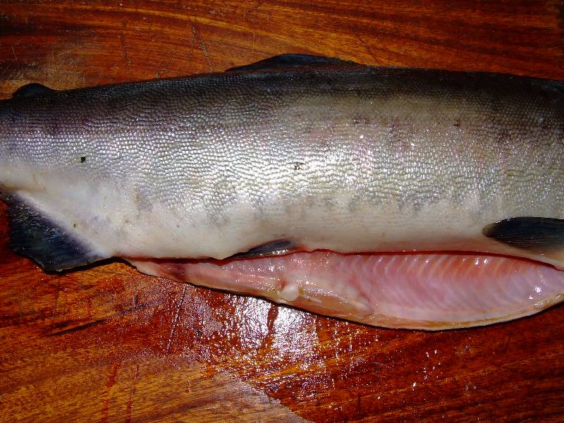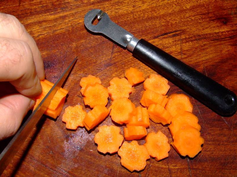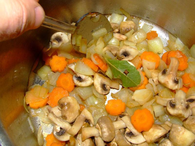 1-prélever les filets du saumon, les couper en morceaux et réserver au frais 2-éplucher les carottes, tailler des encoches longitudinales à l'aide d'un canneleur et couper en rondelles, découper l'oignon en petits cubes et les champignons en quatre 3-faire chauffer dans une casserole 2 cuillères à soupe d'huile, y mettre les oignons, les carottes, faire dorer, puis ajouter les champignons et faire cuire 5 minutes sur feu vif en remuant sans cesse 4-saupoudrer de farine, recouvrir d'eau, ajouter la gousse d'ail piquée d'une feuille de laurier avec un clou de girofle, saler, poivrer et laisser mijoter pendant 30 minutes |