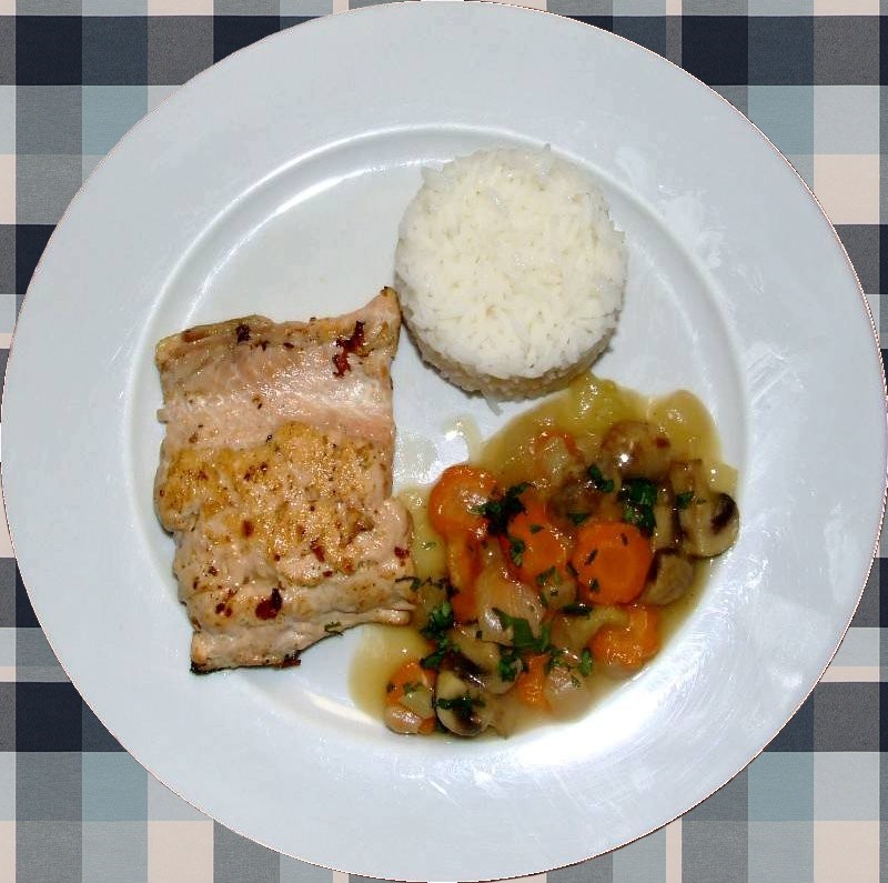 5-15 minutes avant la fin de cuisson, mettre une casserole d'eau salée à bouillir, faire cuire le riz, 6-pendant ce temps, faire frire dans une poêle les morceaux de saumon coté peau pendant 3 minutes, les retourner et cuire encore 2 minutes, réserver 7-égoutter le riz, mettre dans chaque assiette du riz moulé avec un cercle, déposer au centre de l'assiette un morceau de saumon accompagné de sauce et sa garniture de légumes et champignons parsemer de persil ciselé et servir aussitôt