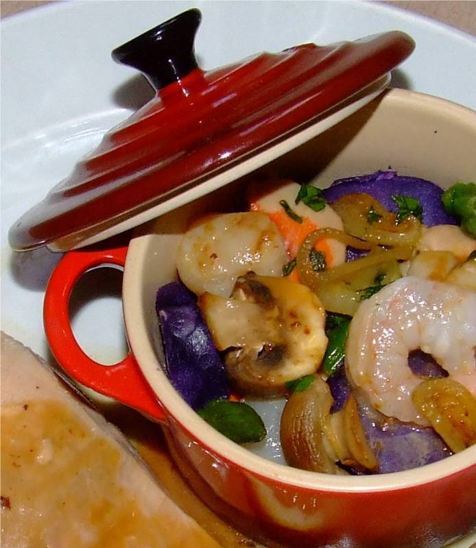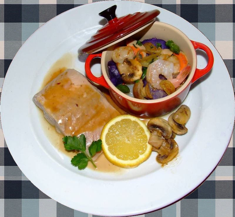 6-dans la poêle ayant servie à cuire le saumon, faire fondre un morceau de beurre, y mettre les champignons et l'échalote, saler, poivrer, bien mélanger et laisser dorer 7-retirer les champignons et l'échalote, de la poêle, y mettre les noix de saint Jacques et les queues de gambas et faire cuire rapidement en faisant sauter, pas plus de 2 minutes, saler, ajouter les asperges coupées en tronçons, les champignons et l'échalotes, et les rondelles de pommes de terre, parsemer de persil plat ciselé, bien mélanger 8-dans chaque assiette, mettre un pavé de saumon, accompagner de fricassée de noix de saint Jacques, déglacer la poêle avec 4 cuillères à soupe d'eau chaude, napper les pavés de saumon et la fricassée et servir vin conseillé: Bandol blanc |
