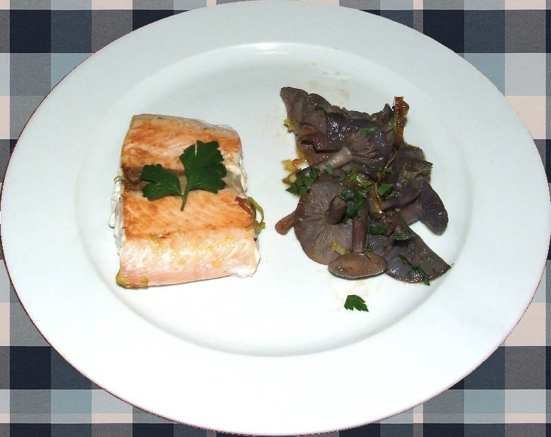 4-sortir les pavés de saumon de la poêle et les réserver, mettre à la place le vert de poireau et faire sauter deux minutes en remuant sans cesse 5-ajouter dans la poêle les champignons, saler, poivrer, bien mélanger avec le vert de poireau 6-pendant ce temps, hacher l'ail et le persil, puis ajouter aux champignons lorsqu'ils sont cuits, bien mélanger 7-disposer dans des assiette chaudes un pavé de saumon accompagné de champignons et servir aussitôt |