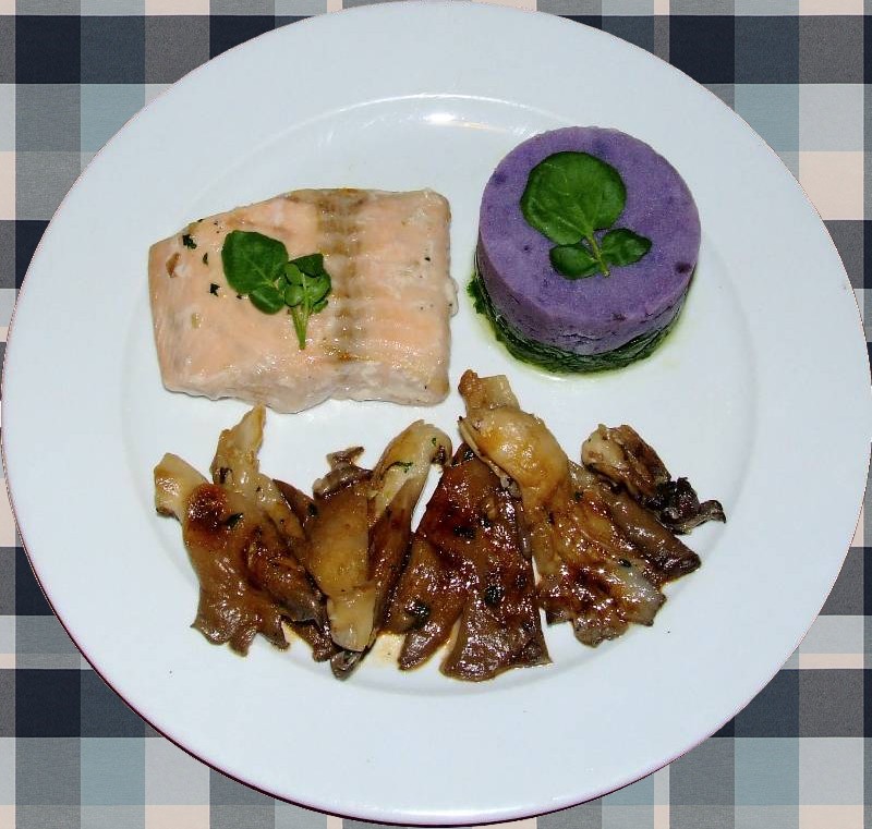 5-trier les champignons, laisser les plus petits entier et couper les plus gros en deux, les mettre dans une poêle avec un peu de beurre, saler, ajouter l'ail et le persil haché, bien remuer, lever les champignons et réserver 6-dans la poêle ayant servie à la cuisson des champignons, mettre le saumon préalablement salé et poivré et faire cuire 2 minutes de chaque cotés 7-enlever les pavés de saumon, ajouter la sauce soja, déglacer avec un peu d'eau chaude et faire réduire 8-réchauffer le cresson, la purée, dresser dans chaque assiette un pavé de saumon entourer de champignon et de purée sur un lit de cresson, napper de sauce et servir aussitôt |