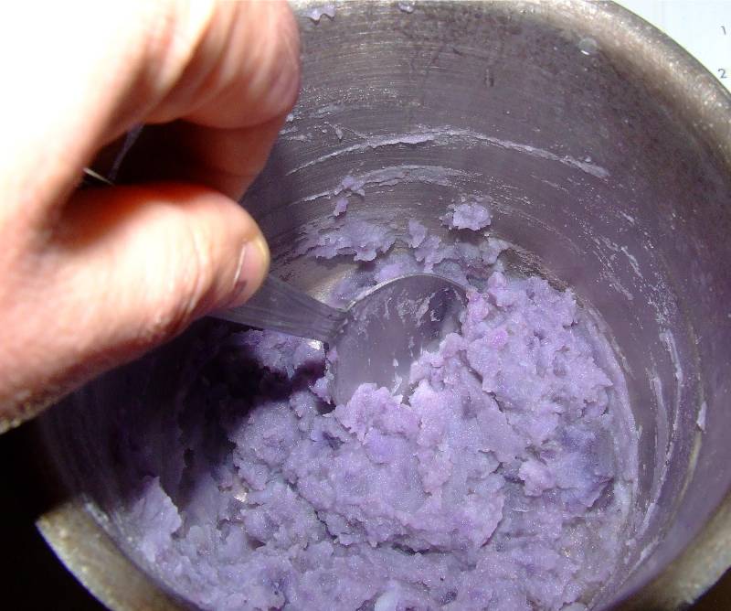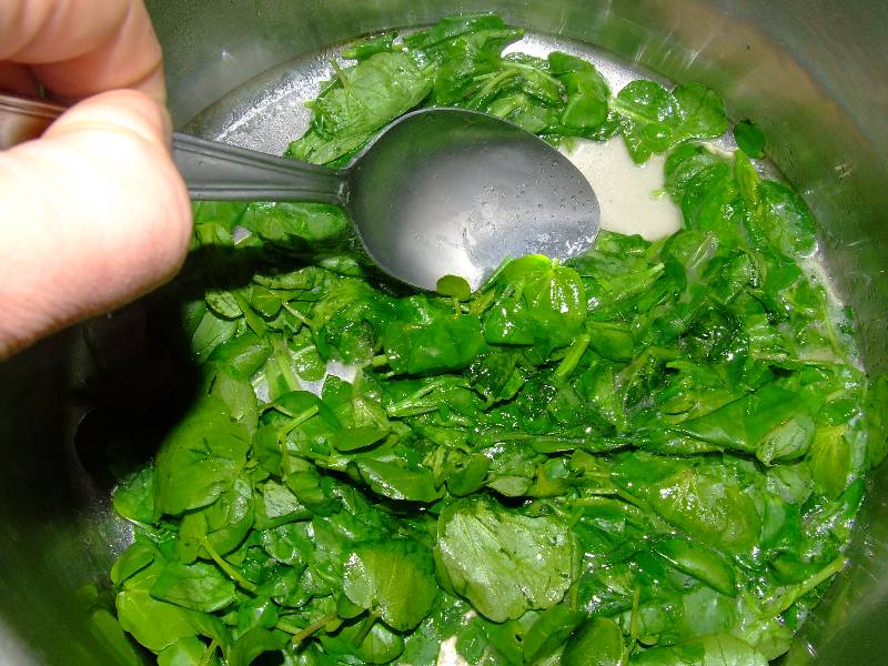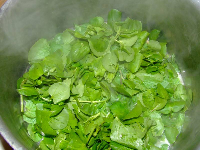 1-pour deux personnes, équeuter et trier le cresson, le laver dans de l'eau fraîche légèrement vinaigrée, puis le faire bien égoutter 2-dans une petite casserole avec une noix de beurre faire suer le cresson jusqu'à évaporation de l'eau de végétation, saler, mélanger, réserver 3-éplucher les pommes de terre, les couper en quartiers et les plonger dans une petite casserole d'eau bouillante salée et laisser cuire 20 minutes (l'eau va prendre une couleur bleu vert, ne pas s'inquiéter c'est normal) 4-au terme de la cuisson des pommes de terre, jeter l'eau de cuisson, ajouter une noix de beurre le lait et écraser les pommes de terre jusqu'à obtention d'une purée et réserver vin conseillé: Cassis blanc |