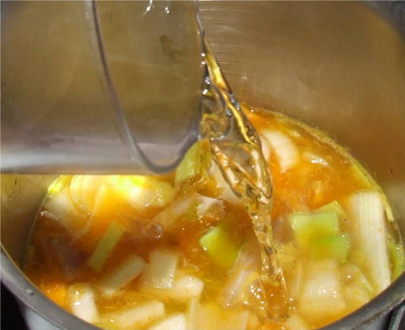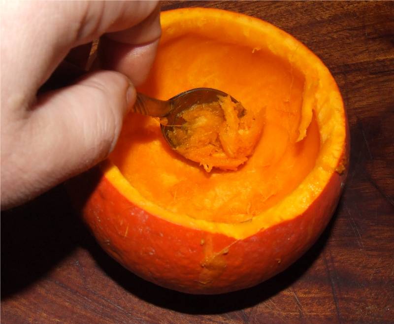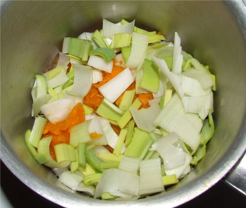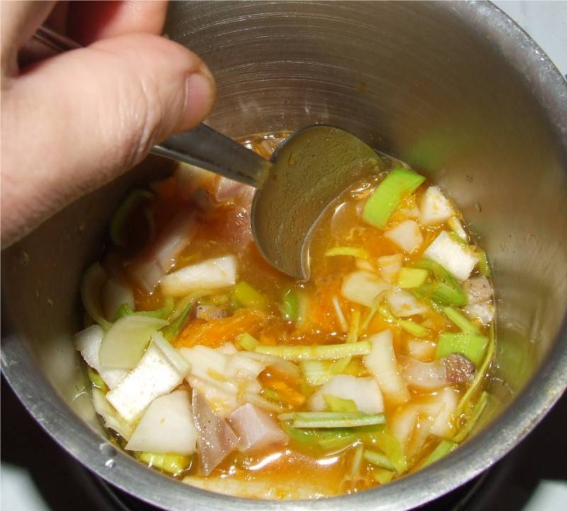 1-couper le dessus des potimarrons aux 3/4 de leurs hauteur et conserver les chapeaux ainsi obtenus, couper si nécessaire la base afin que les potimarrons puissent tenir bien droit 2-creuser les potimarrons à l'aide d'une cuillère, en prenant soin d'éliminer les graines et les filaments, réserver les potimarrons creusés, mettre la chair ainsi récoltée dans une casserole contenant un morceau de beurre 3-ajouter dans la casserole le navet coupé en dés, le blanc de poireau et le vert tendre coupés en 2 dans le sens de la longueur puis en petits tronçons, la poitrine salée coupée en dés et faire suer le tout sur feu moyen sans laisser colorer 4-ajouter le cube de bouillon de volaille, mouiller avec de l'eau au double de la hauteur des légumes et cuire à feu doux à couvert pendant 35 minutes |