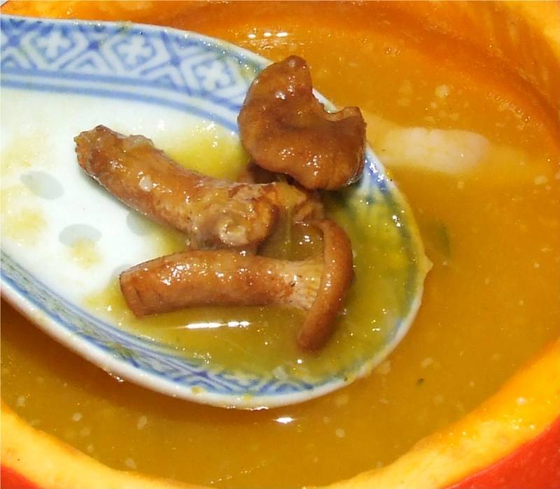 5-au bout des 35 minutes, dans une petite casserole d'eau bouillante salée, plonger les girolles soigneusement nettoyées pendant 3 minutes pour les blanchir, puis les égoutter rapidement et réserver 6-passer la soupe de légumes au mixer ou au moulin à légumes, ajouter les girolles et remettre sur le feu pendant 5 minutes, les girolles doivent rester croquantes sous la dent, rectifier l'assaisonnement en sel et poivre selon le goût 7-ébouillanter les écorces de potimarrons qui vont servir de soupières individuelles, bien essuyer l'intérieur 8-remplir chaque potimarrons avec la soupe, ajouter du beurre ou un peu de crème fraîche si vous le désirez, servir aussitôt vin conseillé: Bordeaux graves blanc |