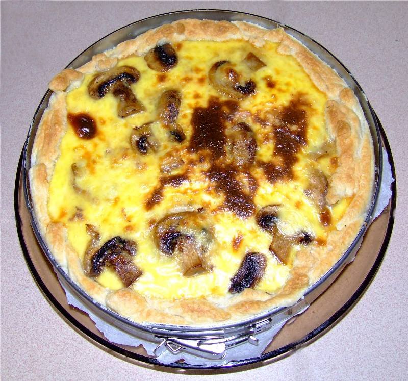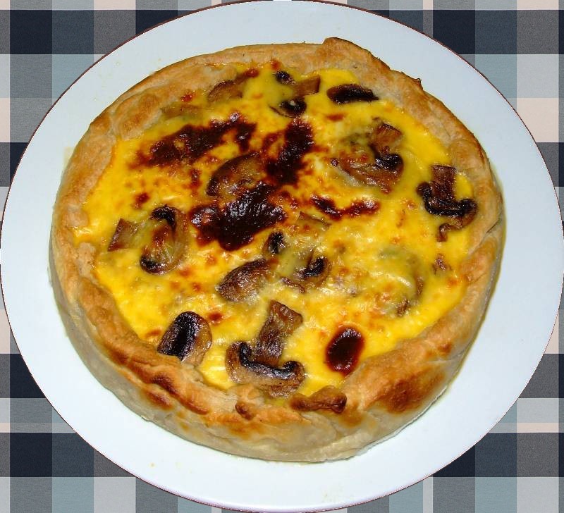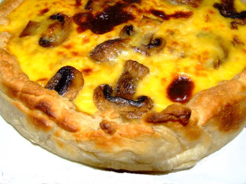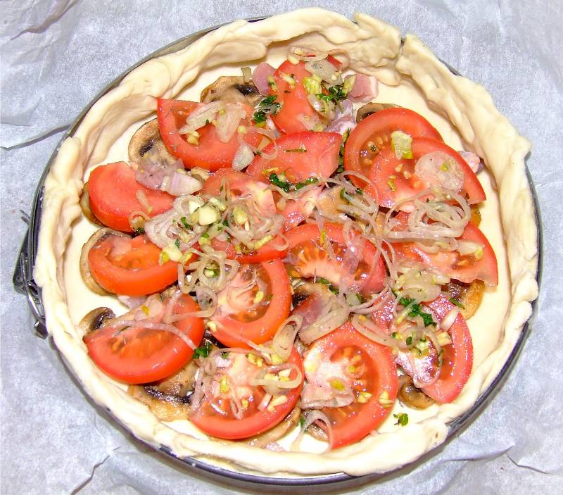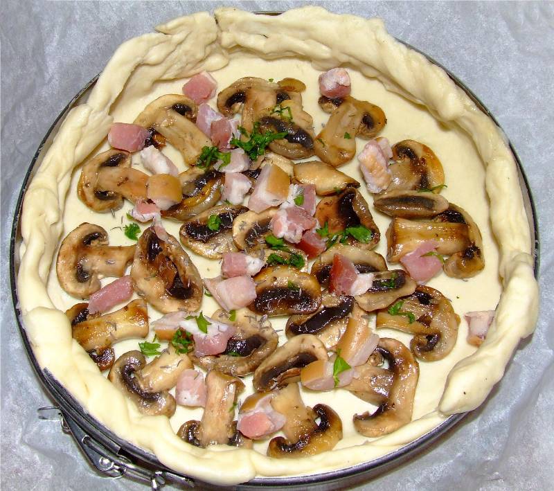 5-sortir la pâte du four, enlever le papier sulfurisé et garnir le fond avec la moitié des champignons, ajouter la poitrine de porc coupée en petit dés, du persil grossièrement ciselé 6-couper les tomates en fins quartiers et disposer par dessus les champignons avec les échalotes, du thym émietté, de l'ail et du persil ciselé 7-recouvrir avec le restant des champignons, saler, poivrer, recouvrir avec la béchamel et enfourner à 220° pendant 30 minutes 8-au bout de 30 minutes, ouvrir le moule à charnière, le retirer et remettre la tourte au four encore 15 minutes pour finir de cuire les bords 9-servir accompagné d'une salade avec une vinaigrette au vinaigre de xérès et quelques croutons aillés vin conseillé: Côte de provence rouge |