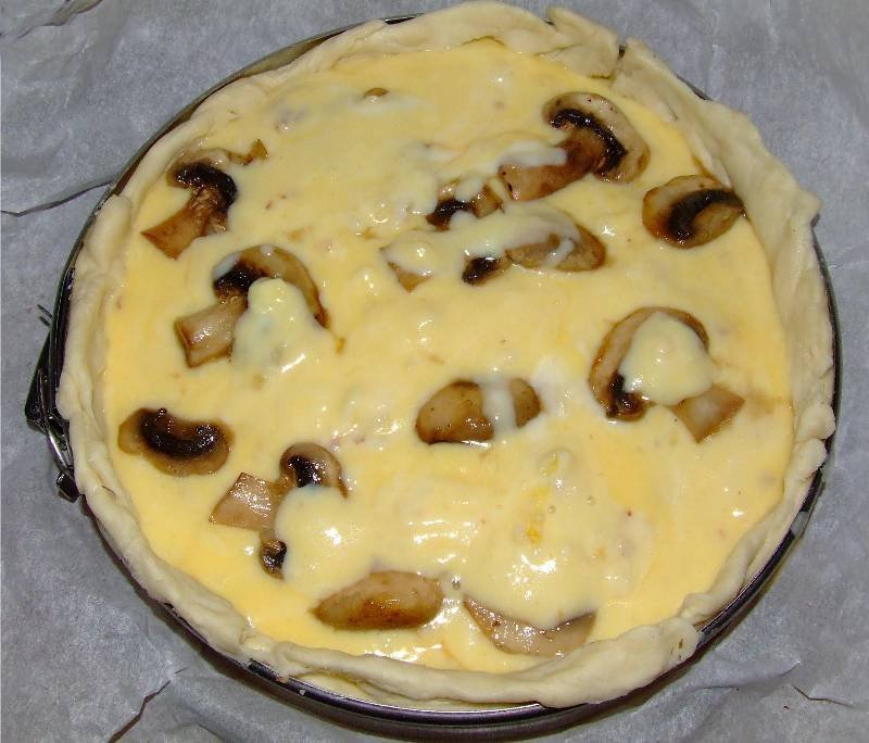 1-garnir un moule à charnière de 20 cm de diamètre avec la pâte, recouvrir le fond avec du papier sulfurisé et mettre à précuire dans un four à 200° pendant 10 minutes 2-pendant ce temps, dans une petite casserole faire une béchamel avec 20 gr de beurre, 20 gr de farine et 25 cl de lait, saler poivrer, laisser épaissir en remuant puis sortir la casserole du feu ajouter 2 oeufs, bien mélanger à l'aide d'un fouet et laisser refroidir 3-émincer les champignons en lamelles, les mettre dans une poêle avec 20 gr de beurre et faire dorer sur feu vif en remuant sans cesse 4-sortir les champignons et les réserver, baisser le feu et mettre dans la poêle les échalotes émincées et faire légèrement dorer pendant 2 à 3 minutes et réserver