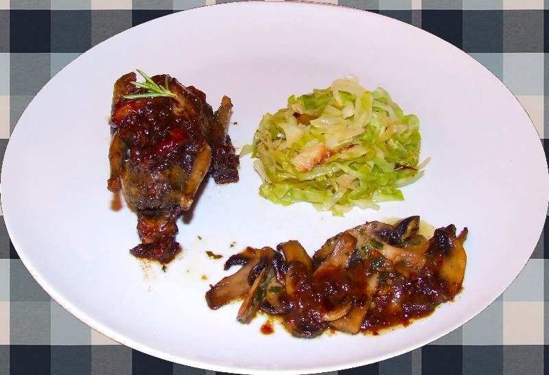 6-dans une poêle avec un bon morceau de beurre mettre les lanières de choux, les saler et faire cuire à feu doux pendant 4 à 5 minutes puis éteindre le feu et réserver 7-au bout des 20 minutes de cuisson, ajouter dans la casserole contenant les tourterelles les champignons préalablement triés, nettoyés et coupés en lamelles et prolonger la cuisson 10 minutes supplémentaires 8-en fin de cuisson goûter la sauce et rectifier l'assaisonnement si nécessaire 9-servir dans chaque assiette une tourterelle, y déposer un petit dôme d'embeurrée de choux, accompagner de champignon saupoudrés de persil haché, napper les tourterelles et les champignons de sauce et servir aussitôt