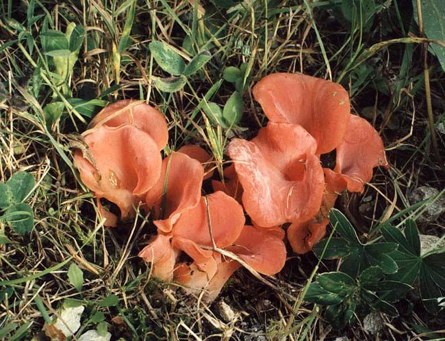 en forme de cornet fendu sur le côté ou en spatule, de 7 à 15 cm de haut, orangé, gélatineuse, face inférieure parfois légèrement plissées. |