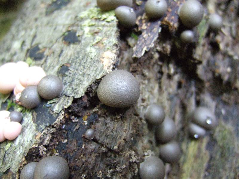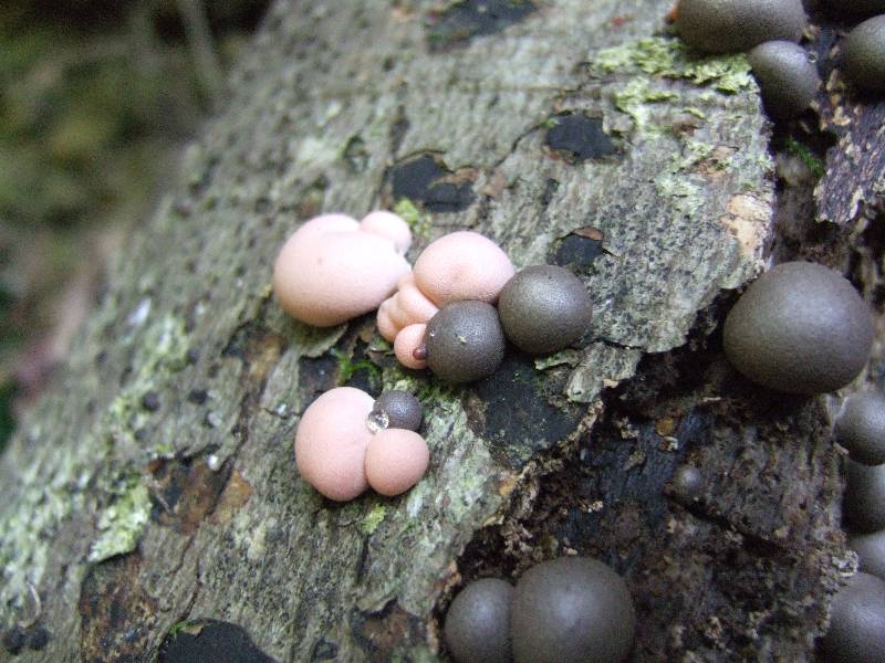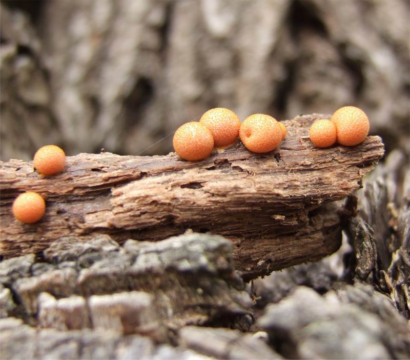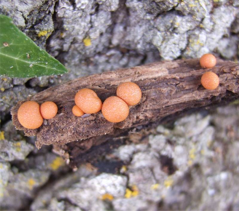 forme globuleuse de quelques millimètres à 2 cm, rose à orangé, molle, devenant irréguliere par compréssion, écrasée avant maturité, l'enveloppe grisonne, passe au brun-rouge puis au noirâtre, laissant perler des goutelettes par temps humide. |