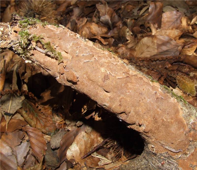 sur la face inférieure humide de branches tombées, surtout hêtre, noisetiers et charmes, toute l'année, courant |