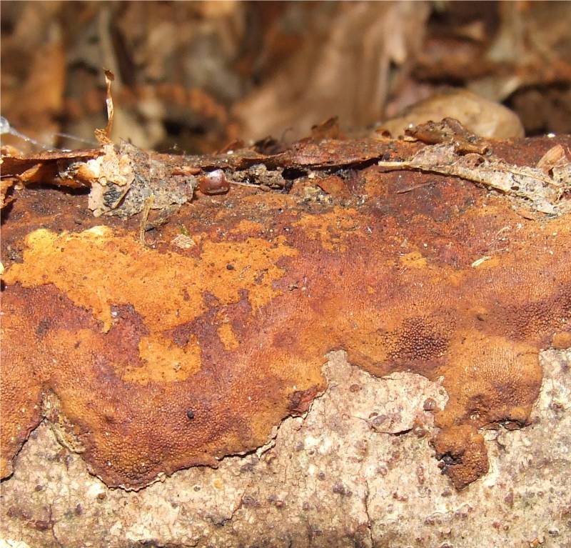 en forme de croûte par endroits bosselée, prenant la forme du support sur lequel il se développe, de couleur brun rouille, la marge se décolle parfois par temps sec |