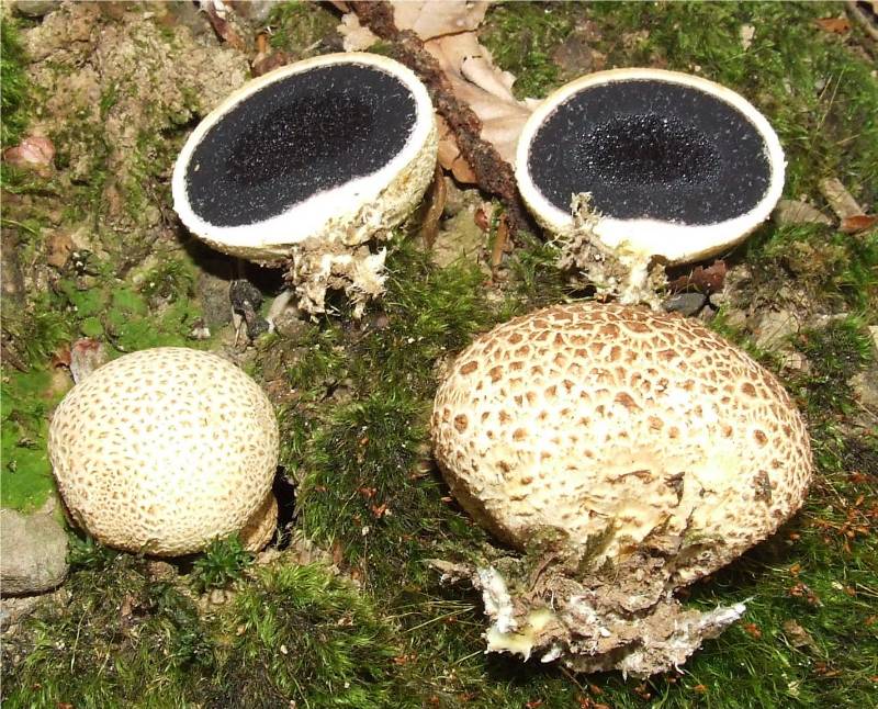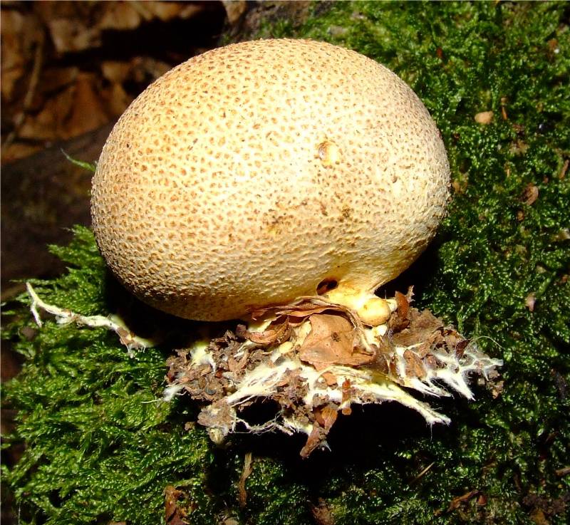 globuleux, de 3 à 15 cm, à sommet aplati, enveloppe externe coriace, crème à orangée, entièrement couverte de verrues pyramidales; rattaché au sol par des filaments courts ressemblant à des racines. |