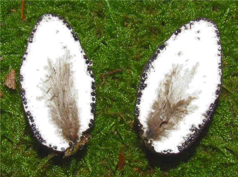 blanche, liégeuse, très coriace, vue en coupe, la périphérie est parcourue de petites cavités noires nommées "périthèces" contenant les spores |